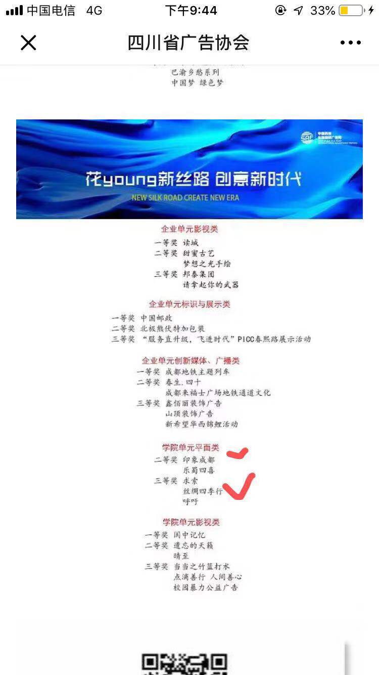 本次大赛由中国广告协会指导,四川省广告协会、封面新闻联手国家广告产业园共同举办。这是一场面向西部地区、汇聚各领域的广告精英,集展览与展示、内容与技术、评奖与观摩、产业与学术为一体的广告盛会。来自中国西部广告协会联盟、四川省内外行业协会、全国知名广告公司、社会各界广告设计爱好者和省内外各大高校在校广告人才广泛关注、踊跃参加,共征集2200余件作品进入海选评审范围。经过公开公正的评审,最终产生了五大类别总计25件获奖作品。 其中,学院单元平面类产生二等奖两项,三等奖两项共计4项获奖作品。